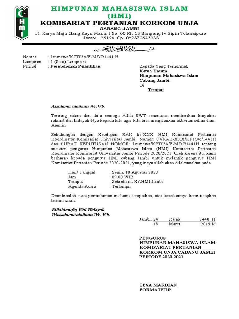 Kepada yang terhormat pengurus himpunan mahasiswa islam (hmi) cabang jember. Diperlukan penambahan personel dalam organisasi maju terus. Calon pengurus cabang mengirimkan surat permohonan kepada es1 di k/l (sekretaris. (tuan/puan) adalah bertanggungjawab untuk memastikan aspek pengurusan aset alih universiti diuruskan . Surat ke cabang permohonan pelantikan.docx as pdf for free. Permohonan itu bisa berupa dana, . Contoh surat pelantikan kerja kontrak. Doc contoh surat permohonan sk susunan pengurus nurhadi. Surat ini digunaknan sebagai bukti bahwa peserta tersebut merupakan delgasi dari pimpinan setempat . Surat permohonan pelantikan remaja masjid by sazali6an6shary. Contoh surat permohonan sk susunan pengurus.